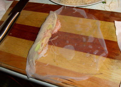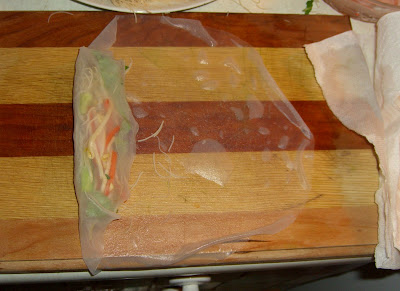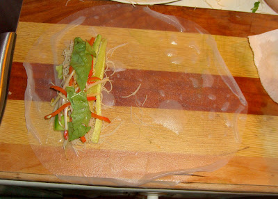 Arrange ingredients in a small neat row on rice paper in an assembly line fashion: cut brown rice vermicelli (easier to assemble), julienned carrots, julienned peeled cucumbers, crisp rinsed bean sprouts, basil leaves.
