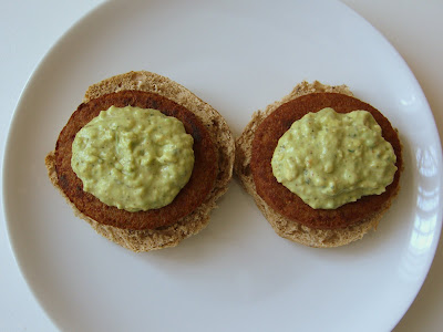 Pile them together open face sandwich style starting with bagel, moderate ring of horseradish sauce, patty, Avocado Mayo on top, and EAT. What, no top bun? NO! Sacrilège! It would send the mayo squirting out everywhere, leaving you wondering if everyone can see that whitish crusty stain on your pants.