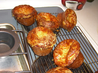 When I asked CC Fried Unicorn Horn Pockets about his recent trip to NYC he mentioned the best thing about eating at BLT Prime (other than the forbidden steak?) were the popovers. A quick link up to the online recipe was provided, and I wanted them then. I could imagine tearing one apart, spackling it with Mama's peach marmalade and eating it Dr. Evil getting the handcuffs's keys from Frau-style. How would it taste, how could they pop right out of their pan hole with that cheesy crusted rug top, and how could I convince my stomach to agree with all the forbidden ingredients?