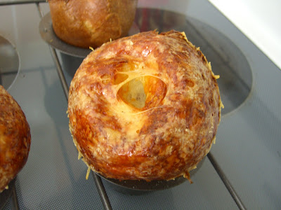 Here's where it gets tricky, according to the tips and tricks of the trade, don't open the oven for 30 mins, then do, pass out from the overpowering smell of baking gruyere, recover and rotate the pan half a turn. Another tip said to bake at 450F for the first 10 minutes, then lower to 350F to ensure maximum popping.