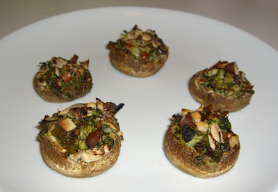 Stuff caps, lightly spray with olive oil, cook at 425F for 15-20ish minutes. They're cooked right before they start to burn.