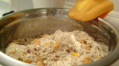 1 cup finely chopped dried fruits (mango, papaya, apricots, maybe kiwi, think about adding raisins and Thor will get you then and there. NO RAISINS!!!)