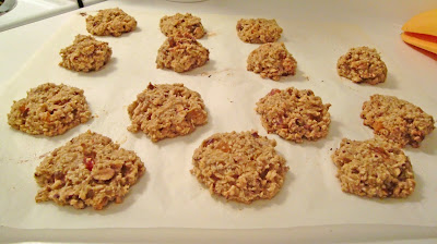 Quit stallin', me. Here's the recipe which I found via some magical google search for oatmeal and coconut cookies and which I can no longer find a link for. All I know is that I found, I switcherooed two items, and ta-da...