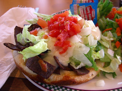 Pizza Delight's donair is piled high on a tough and chewy pizza dough and comes with a steak knife because frankly, it's unfold able and there's no other way to eat that bad boy.