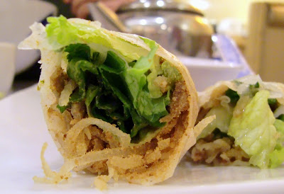 What I didn't expect, was the extremely off tasting sandy texture of the shredded pork rice rolls. Oh wow, what is IN it? Neither of us could stomach to finish one. The rice noodles were normal, the shredded pork was normal, the lettuce was normal, but mixed in was this ew flavored thing textured like sand. The delicious dipping sauce did nothing to improve the taste or dryness of the wrap. When we later asked what ingredients were in the roll other than noodles and pork, the only offered answer was "pork, shredded".